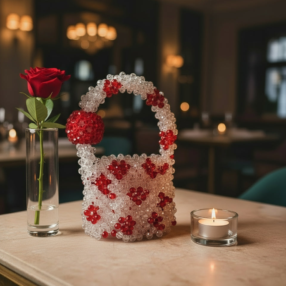 Embrace captivating glamour with the Rendezvous Crystal Beaded Mini Bag. This exquisite medium-sized handbag is a true spectacle of artistry, meticulously hand-beaded with shimmering white crystal beads that provide a brilliant base. The design features a delicate, all-over pattern of bold red crystal hearts, making this accessory a wearable piece of luxury art.