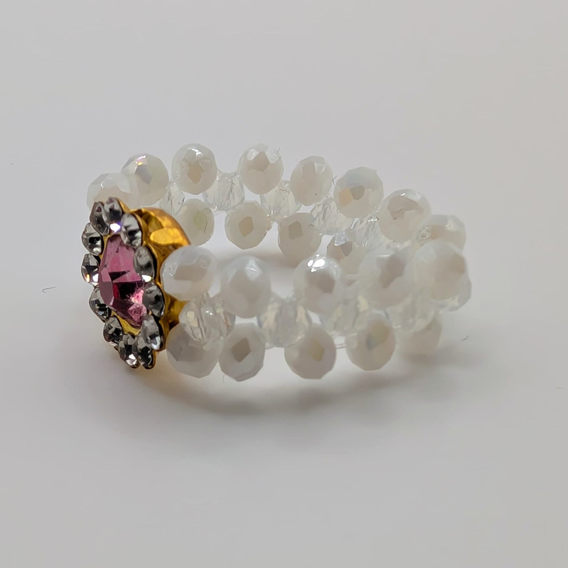 Elegantly feminine, the "Victorian Rose" Beaded Ring adds a touch of sophisticated sparkle to any ensemble. This ring features a delicate flower-shaped centerpiece with a central rose-colored gemstone surrounded by clear sparkling crystals, all set on a handwoven band of iridescent white faceted glass beads. The design captures and reflects light beautifully, creating a subtle yet eye-catching effect.
